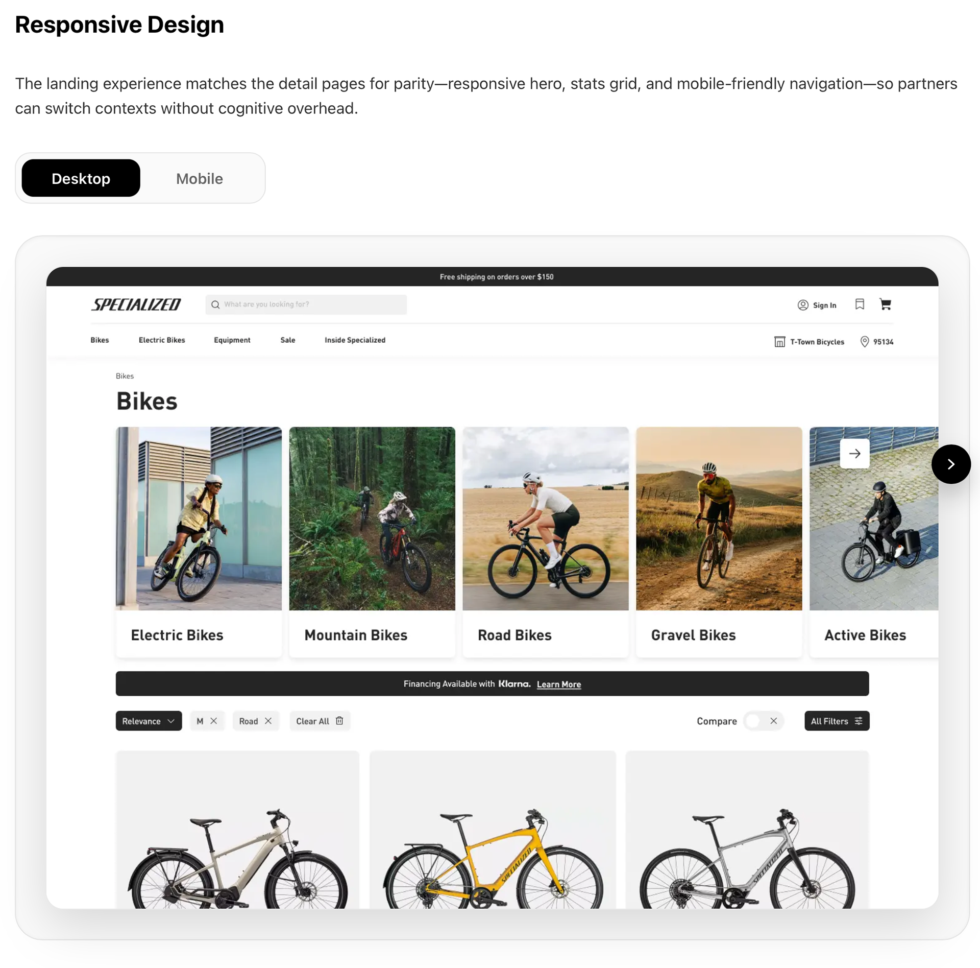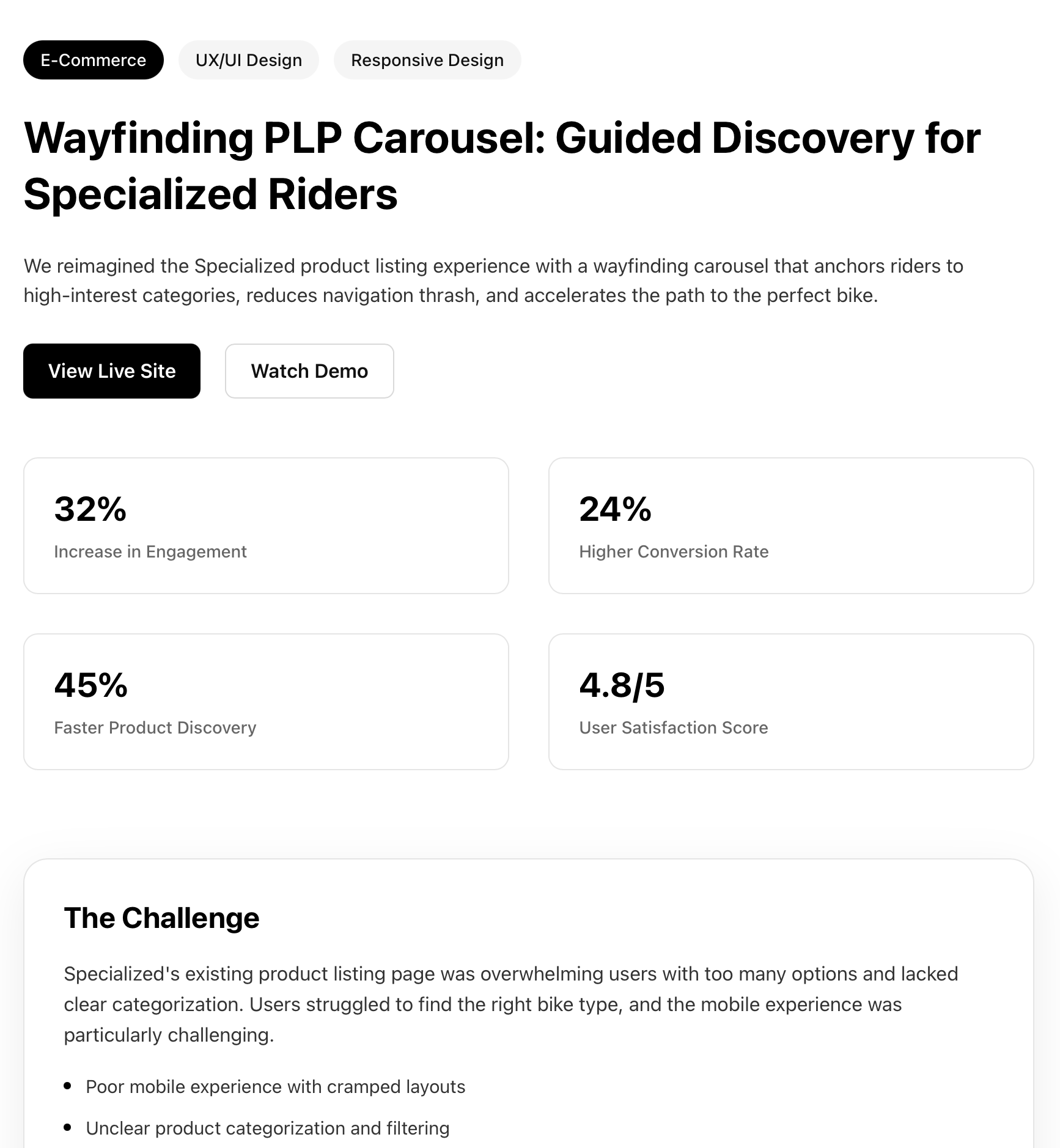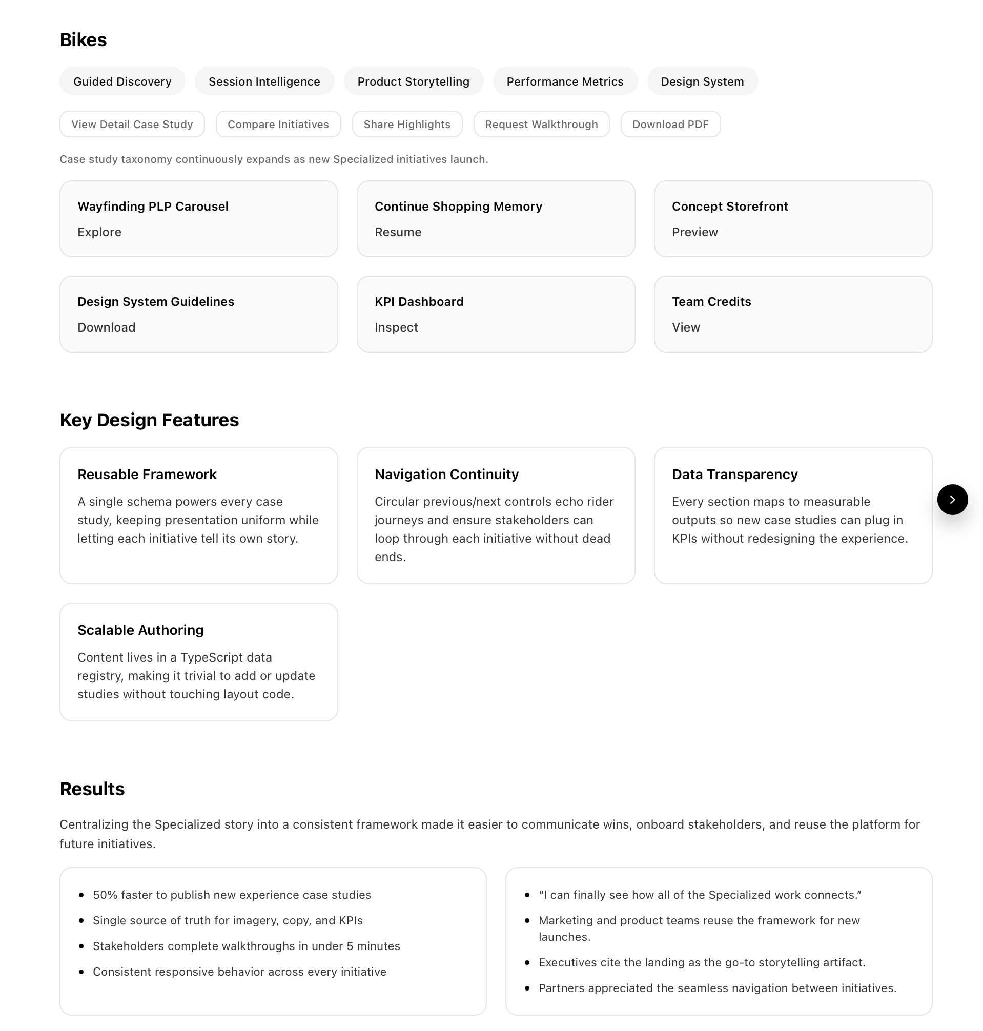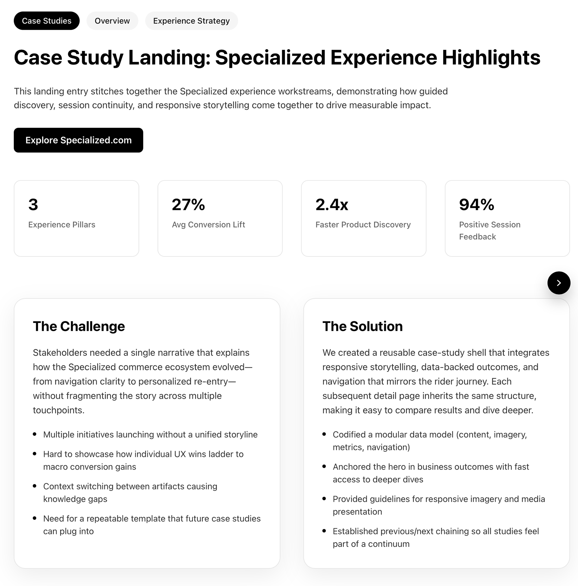 Specialized Wayfinding Case Studies Next.js 16 App Router showcase with typed content modules, data-driven navigation, and a custom OG image generator. The landing and slugged pages share a single client component while styled-components SOC modules keep presentation isolated. I led this work as Senior Frontend Engineer & UX Feature Lead at Specialized—co-created strategy with design, hand-built the PLP carousel without third-party libraries, architected performance-focused deployments (ISR, caching), and drove A/B experimentation across markets. These highlights represent a broader program of 50+ PLP enhancements that consistently lifted conversion, session continuity, and revenue.